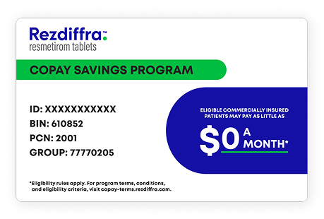 Eligible commercially insured patients may pay as little as $0 a month* with the Rezdiffra Savings Card.